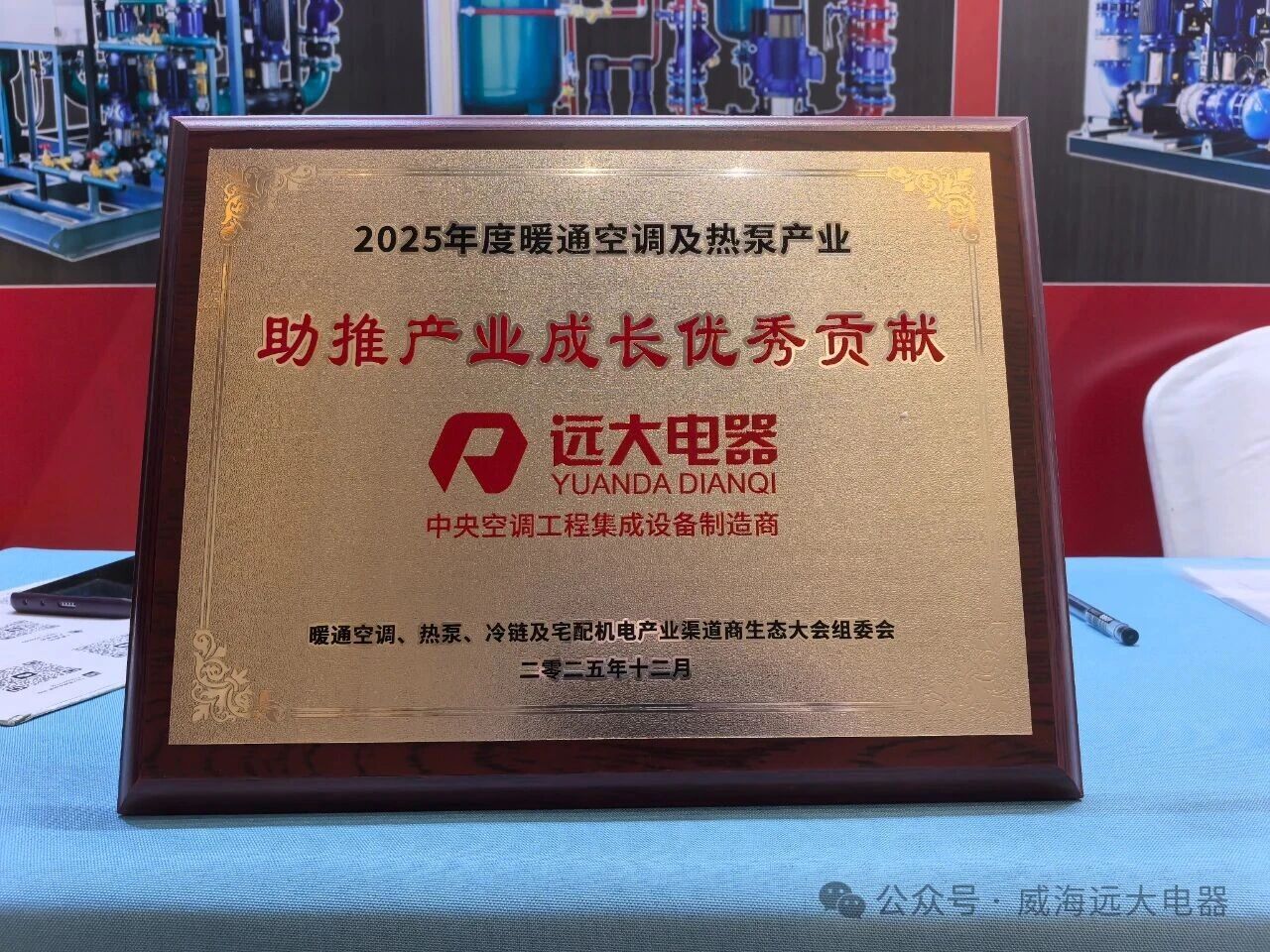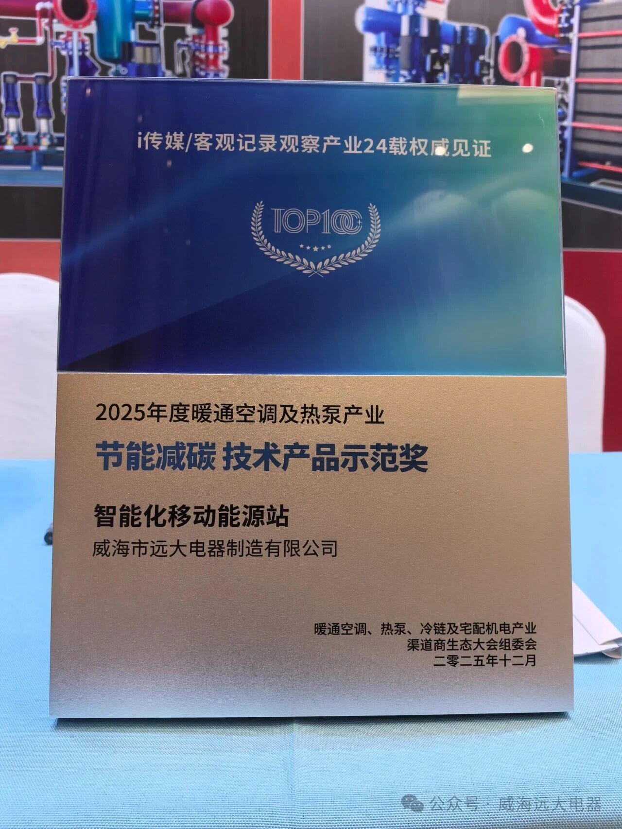 而在這場產業盛會上,威海遠大憑借硬核實力脫穎而出,一舉斬獲兩項重磅榮譽——“2025 年度暖通空調及熱泵產業助推產業成長優秀貢獻” 獎、“2025 年度暖通空調節能減碳技術產品示范獎”(獲獎產品:智能化移動能源站)